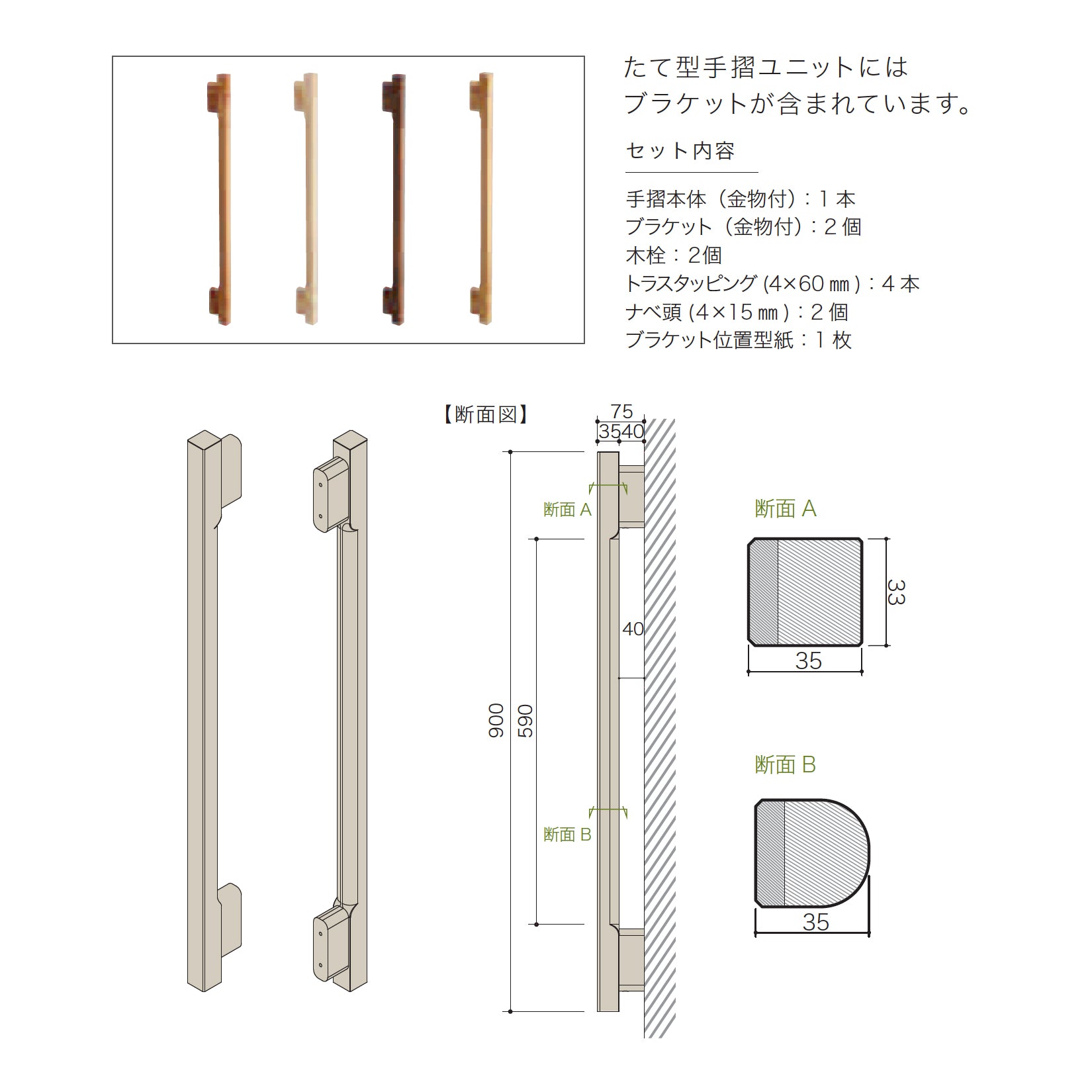 銘木無垢手摺(たて型ユニット)900タイプ